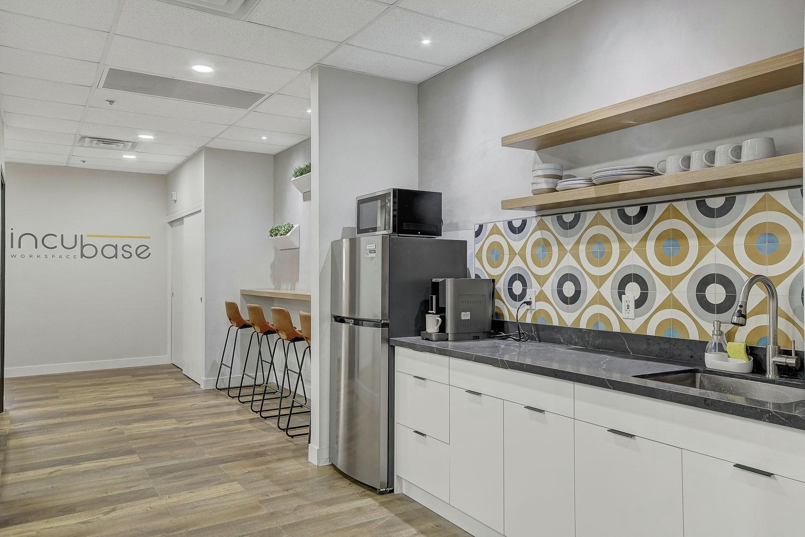 Furnished kitchen access with complimentary beverages and snacks